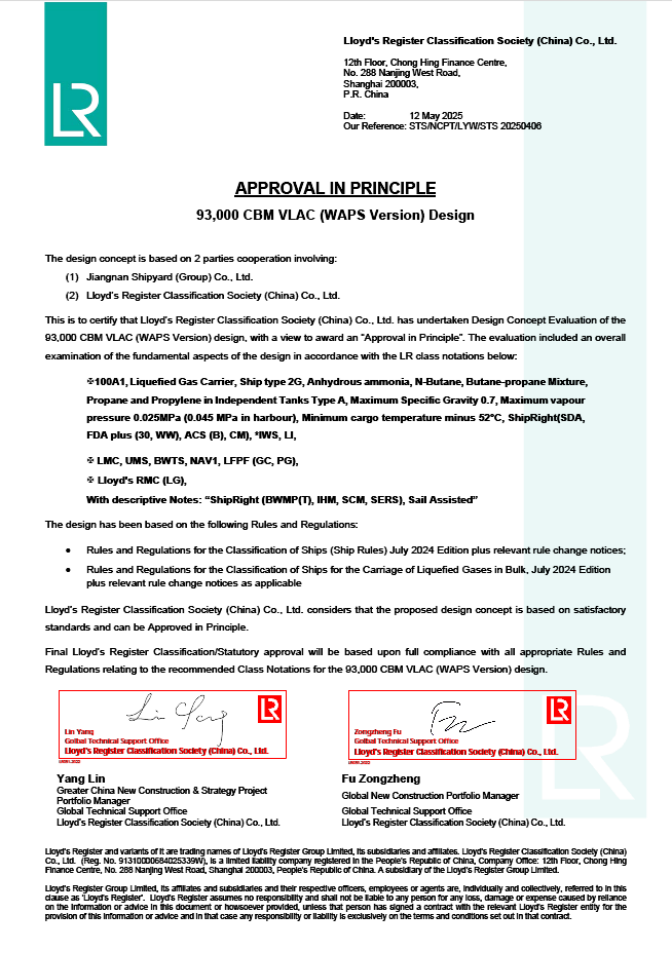 近日,中船集团江南造船自主研发的93000立方米超大型液氨运输船(VLAC)转子风筒节能技术应用方案,正式获得英国劳氏船级社(LR)颁发的原则性认可证书(AIP),标志着全球首例转子风筒在超大型液氨运输船上的应用迈入商业化新阶段。